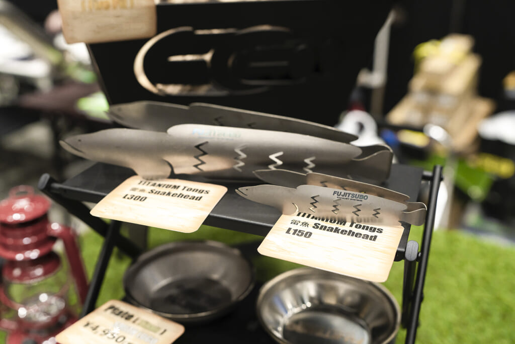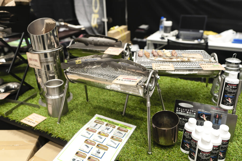 「SMITH SUSono」のブランド名で展開されているのは、バーベキュー用のアウトドアツール。ただし、見た目は完全にマフラーパーツです。バーベキューコンロやテーブルはサイレンサー部分を半分に割ったものを利用。またトングはマフラー製作時に出る端材を活用し、魚の形にデザインされるなど遊び心たっぷり。
