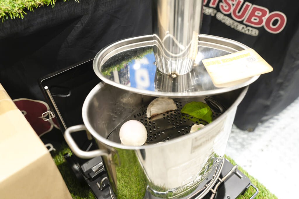 そして何よりも傑作なのがスチーマーとファイアストーブ。スチーマーはタイコとリアピースが一体となったものを使用しており、見た目はまさにマフラー。内部にはFUJITSUBOのロゴも刻まれるなど作り込みも細かいのが特長です。ファイアストーブもリアピースそのままの形状で、思わず笑みがこぼれます。