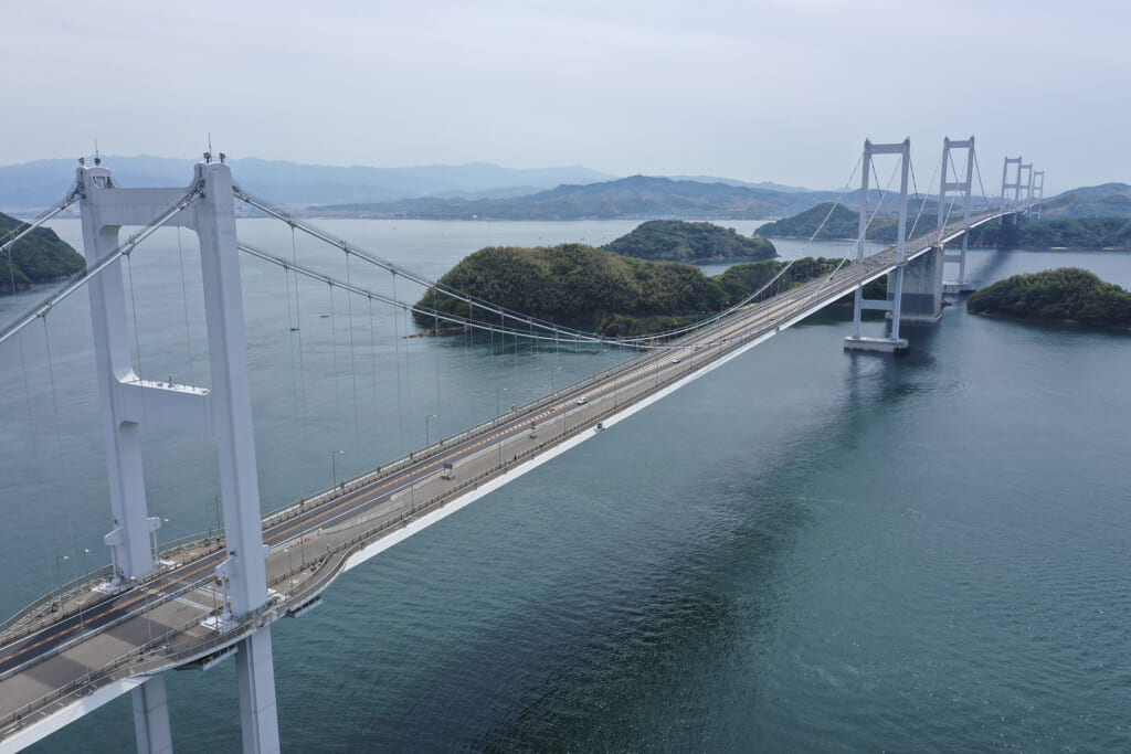 最後のひとつが、愛媛県今治市と大島のあいだにある来島(くるしま)海峡。ここには世界初の3連つり橋である来島海峡大橋が架けられ、両端には小型バイク道や自転車・歩行者道も整備されています。瀬戸内海の美しい多島海を眺めながらサイクリングできる絶景スポットとして人気を集める場所です。