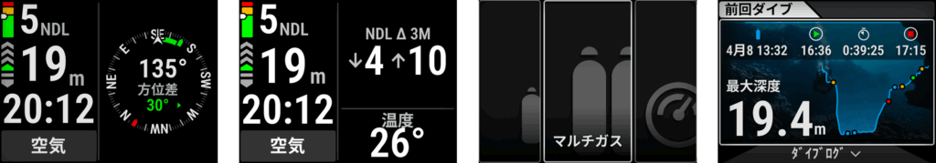 また、ダイナミックな深度グラフによりスクエア画面を活かし、潜水中の深度変化や浮上プランをリアルタイムかつダイナミックなグラフ表示で確認できるため、安全管理が直感的かつ容易になります。