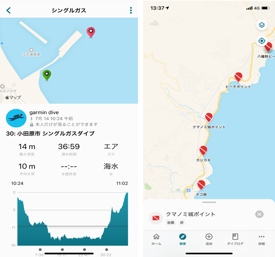 スマートフォンアプリ「Garmin Dive App」とペアリングすることで、潜水データの記録・トラッキング・共有を無制限に行うことができます。アプリを通じて、潜水に適した新しい場所の検索、他のユーザーの公開記録の閲覧、潜水場所の評価・レビューなども可能です。
