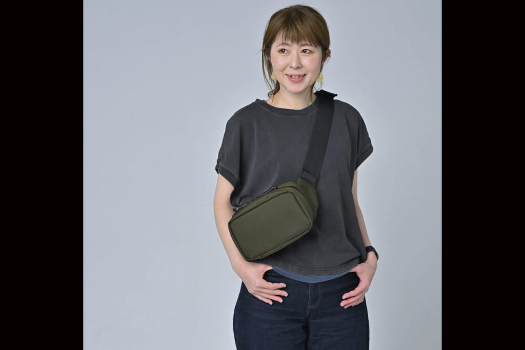 「lauff[ラフ]」の魅力は機能性にとどまりません。装飾を抑えたミニマルなフォルムに、収納部の柔らかな曲線やレザータグ付きファスナーが上品さを添えます。ボディバッグとして、スタイルを選ばず活躍する一品です。