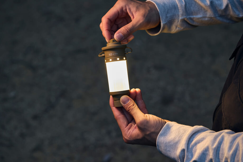 「Hang Light Mini」の魅力は、気軽に持ち運びやすいコンパクトなサイズ感。本体は高さ約13.5cm、直径5cmほどの小ささなのでかさばりにくく、キャンプなどのアウトドアシーンではもちろん、災害時などにも役立ちます。