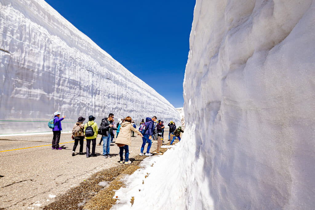 四季折々の景観を圧倒的なスケールで堪能できるのも、立山黒部アルペンルートの大きな魅力です。春から初夏にかけては、高さ20mにも迫る雪壁がそびえ立つ「雪の大谷」ウォークが人気。まるで白銀の世界に迷い込んだような幻想的な感覚に包まれるでしょう。