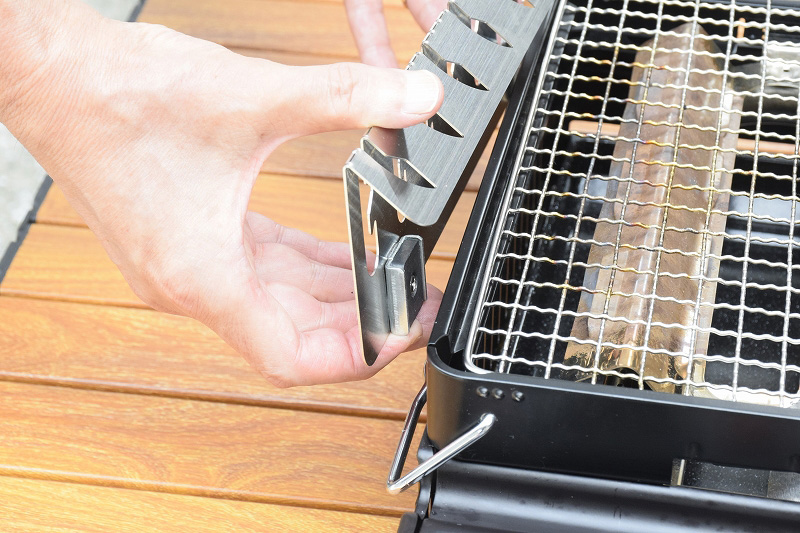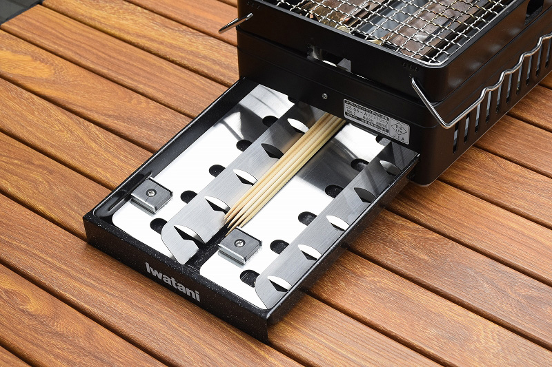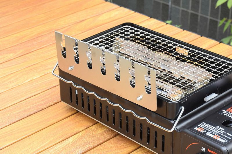 また、市販のカセットコンロやイワタニ炉端焼き器「炙りや」など(※詳細はホームページにてご確認ください)に強力な磁石でピタッ!と固定できるため、設置も非常に簡単で安全です。使用しないときは、炉ばた焼き器の水トレーにぴったりと収納できるコンパクト設計も魅力です(※写真はイワタニ炉端焼き器「炙りや」に装着)。