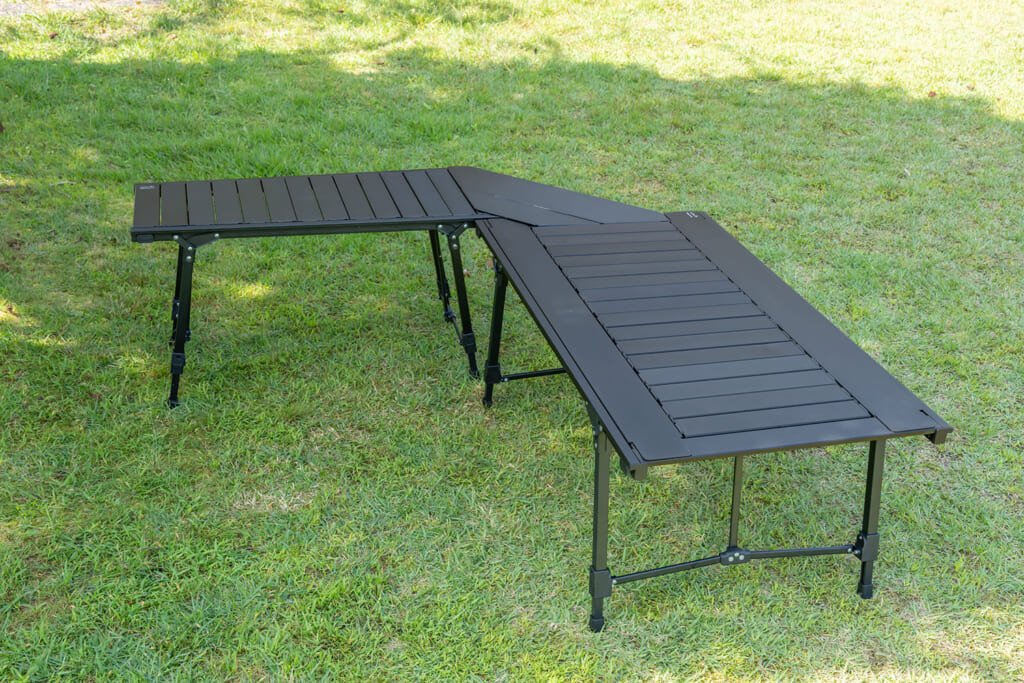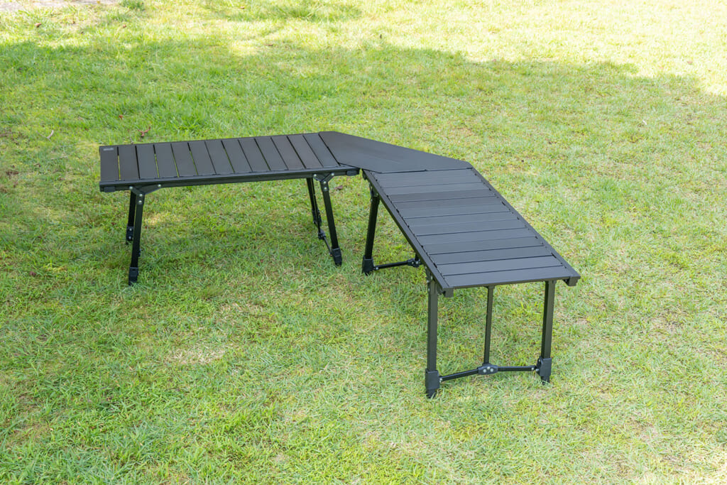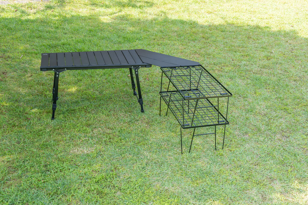 「アルミユニットテーブル88」同士を直角に連結することで、L字型やコ字型など、キャンプサイトのスペースや動線に合わせて自由自在なレイアウトが可能になります。また、「アルミユニットテーブル88」と「アルミユニットテーブル110」の組み合わせや、ラックとテーブルの連結にも対応し、キャンプサイトの使い勝手を飛躍的に高めます。