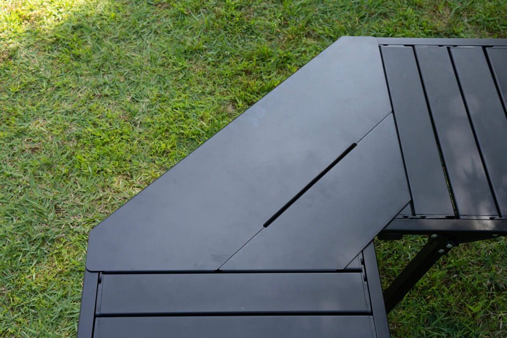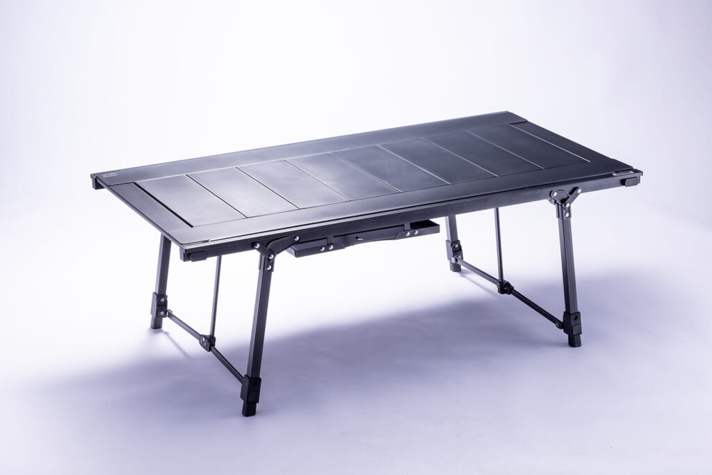 特筆すべきは天板の仕様です。通常モデルは折り畳み式ですが、本モデルの天板は折り畳み構造を省き、よりシンプルで洗練された見た目を実現しました。さらに、天板に樹脂パーツを使用していないため、ダッチオーブンなどの熱い調理器具も気兼ねなく直接置くことが可能です。