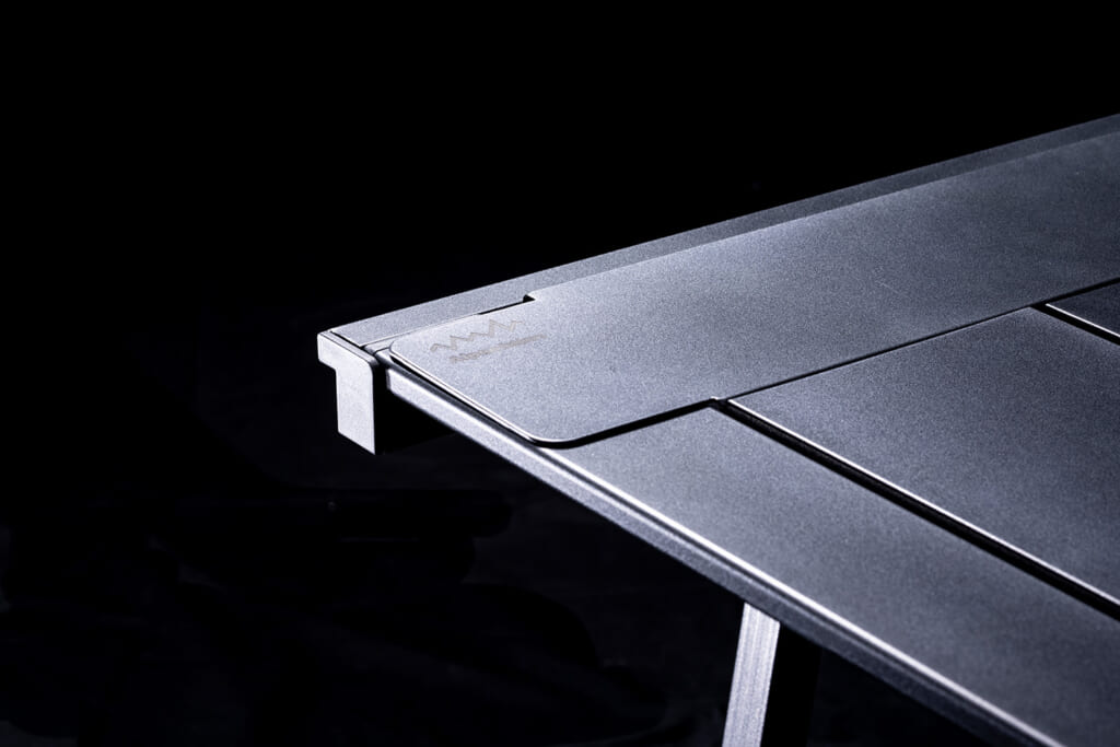 本モデルは、重量は軽く扱いやすいままに、見た目に重厚感のあるメタリックカラーの特別な塗装が施されています。ロゴは通常モデルのホワイトプリントから、高級感のあるレーザー刻印に変更。特筆すべきは天板の仕様で、通常モデルは折り畳み式ですが本モデルの天板は折り畳み構造を省き、よりシンプルで洗練された見た目を実現しました。さらに、天板に樹脂パーツを使用していないため、ダッチオーブンなどの熱い調理器具も気兼ねなく直接置くことが可能です。