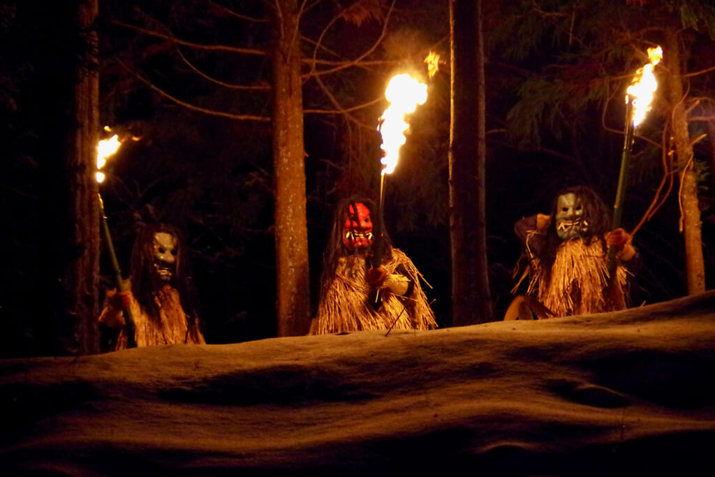 秋田県男鹿市で毎年2月におこなわれる「なまはげ柴灯(せど)まつり」は、ナマハゲが主役のイベント。真山神社の境内で柴灯火が焚かれるなか、鬼のような姿のナマハゲが舞う光景は圧巻です。