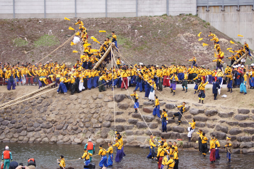 なかでも有名なのが「木落し(きおとし)」。氏子たちが巨木にまたがり、傾斜35度・長さ100メートルもの急坂を一気に滑り落ちるという迫力満点の神事です。巨木が傾斜を滑り落ちる際の振動や轟音、歓声と緊張感が入り混じる空気は、まさに現地でしか味わえない臨場感。見る人の心をつかんで離さない、大迫力の祭りです。