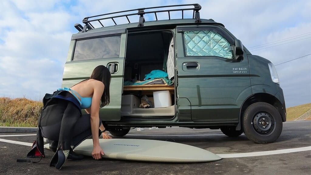 準備を終えたら、いよいよ出発。最初に訪れたのは、本須賀海岸という人気のサーフスポットです。目の前に広がるビーチと広々とした駐車場は、車中泊にもぴったり。初日はここで一夜を明かし、翌朝に海でサーフィンを楽しみます。