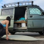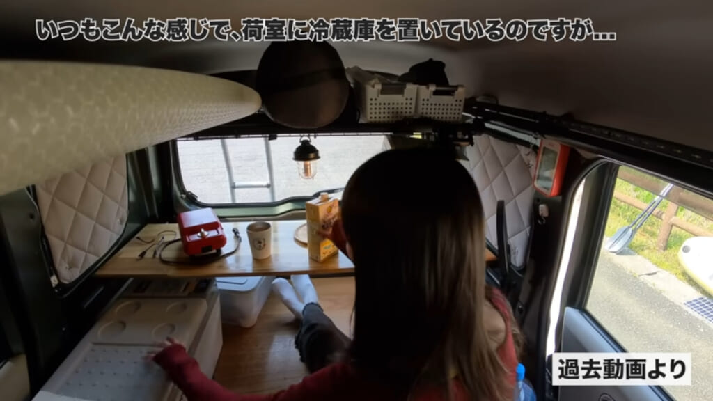 出発に向けてまずは旅支度。初日の車中泊に備えて、手際よく荷物を積み込んでいきます。海子さんの軽バンは、車内のレイアウトや収納まで使いやすく工夫されたオリジナル仕様。冷蔵庫を積んでもゆとりある広さで、まるで秘密基地のような空間が広がっています。