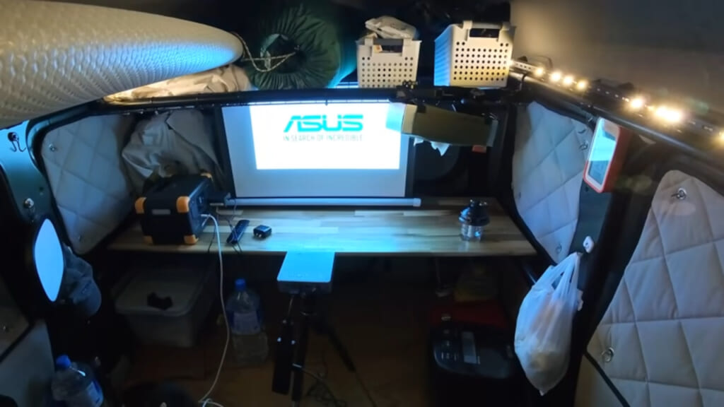 食後はゆったりと、リラックスタイム。ロールスクリーンにプロジェクターで映像を投影すれば、車内がたちまち小さな映画館に。誰にも邪魔されずお気に入りのNetflix作品をのんびり鑑賞する時間は、まさにひとり旅ならではの贅沢ですね。