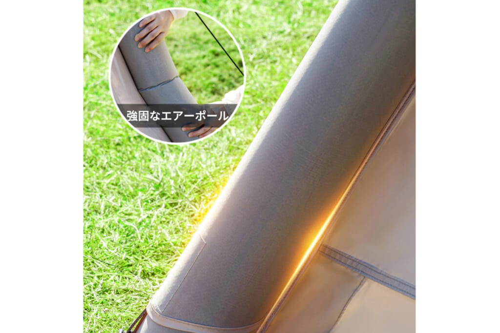 TAILIは「無骨エアーポール構造」を採用。充満したエアー柱がしっかりとテントの形状を保持し、7級の強風にも耐えられる設計です。突風が吹き付ける野外キャンプでも、テントの形状をしっかり保持し、安定性と使いやすさを両立したアウトドアライフに最適なパートナーとなります。