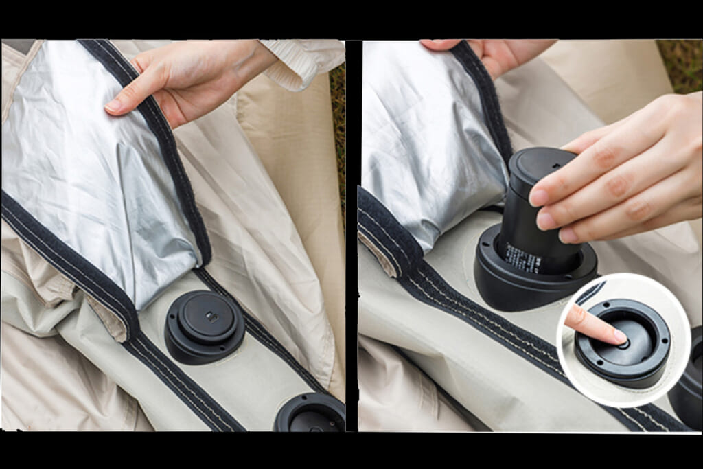 TAILIエアテントの最大の魅力は、その圧倒的な設営・撤収の簡便さにあります。付属する電動ポンプをフレーム部のバルブに繋ぎ、スイッチを一押しするだけで設営がスタートします。