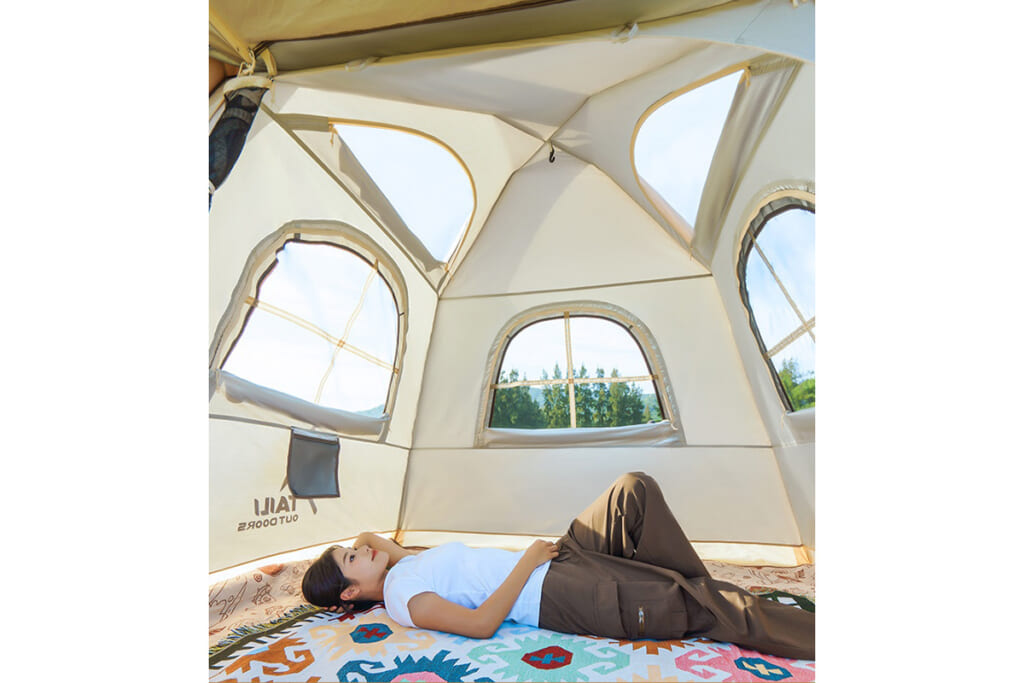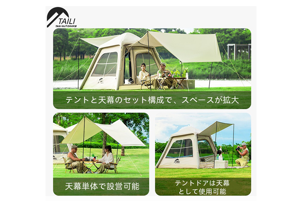 そこでTAILIエアテントは、この課題を根本から解決するために開発。骨組みとなる部分を、空気で膨らませるエアチューブ(エアーポール)で構成。これにより、「キャンプの準備で時間を費やしたり、手間をかけたりすることはもう過去のもの」となり、ユーザーはより多くの時間を自然との触れ合いや仲間との交流に費やせるようになります。