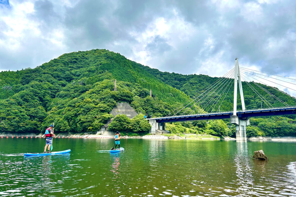 自艇持ち込みで1艇500円。SUPのスタートは永歳橋下の丹沢湖ボートのりば近くからです。権現山を望み、SUPに乗りながら永歳橋を下から見上げる風景もオツなものです。春は桜、秋は紅葉。風光明媚な景色と静寂の湖面をSUPでゆっくりと楽しむことができます。