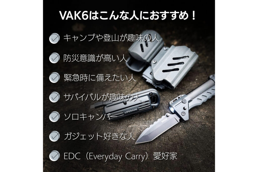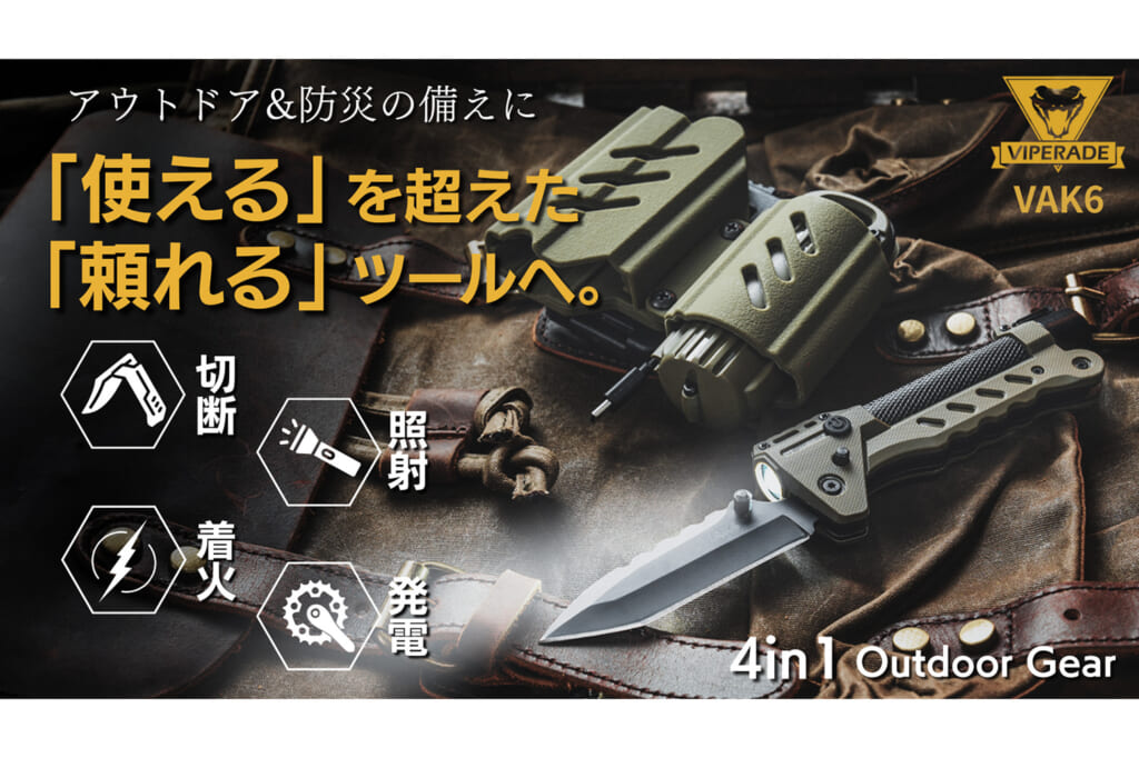 キャンプや登山、そして予期せぬ災害……。「もしも」の時に本当に頼れる道具とは何か? 従来のマルチツールは多機能である反面、個々の機能が中途半端になりがちでした。株式会社F&HARUはこの課題を解決するため、アウトドアでも非常時でも「本当に使える機能」を厳選し、「切る、照らす、火を起こす、発電」という4つの核となる機能をひとつのギアに凝縮したのが「VAK6」です。