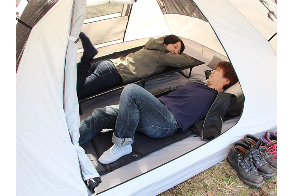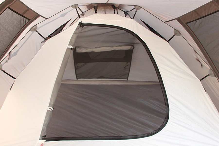 インナーテントのサイズは210cm×210cm。大人2人が寝転んでもゆとりのあるスペースを確保しており、大人3名まで収容可能です。睡眠スペースはもちろん着替えや身支度、メイク道具や荷物の整理のための十分なゆとりを確保しテント内で快適にくつろげる環境を提供します。