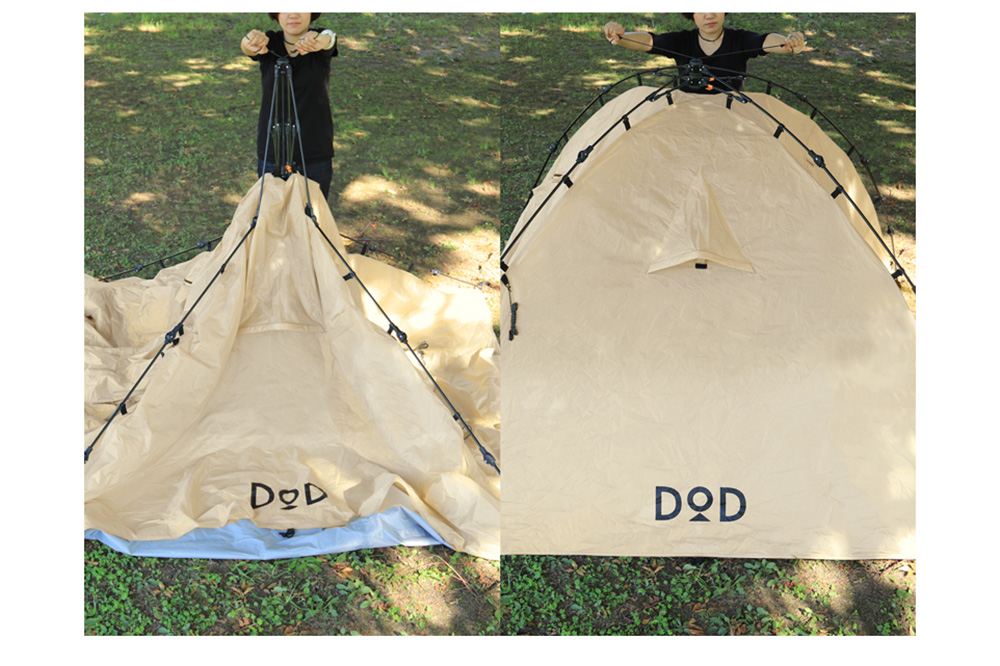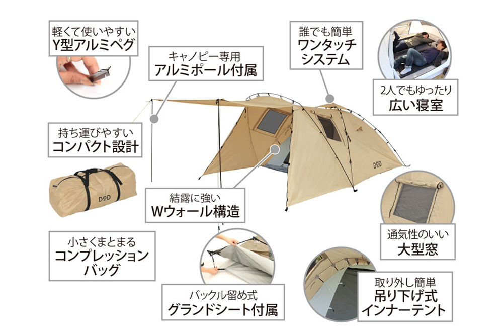ビーズ株式会社が展開する遊び心あふれるアウトドアブランド「DOD」は、2〜3人での使用に最適なワンタッチテント『ライダーズタンデムテント』(T3-485-TN/T3-485)を好評販売中です。
