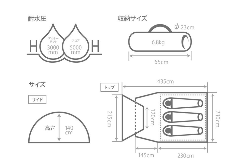 また、高い耐水圧としてフロアの最低耐水圧は5000mm、アウターテントは3000mmと、急な雨や地面からの浸水にも対応できる十分な防水性能を備えています。
