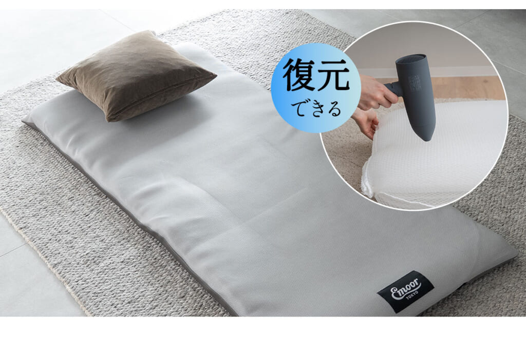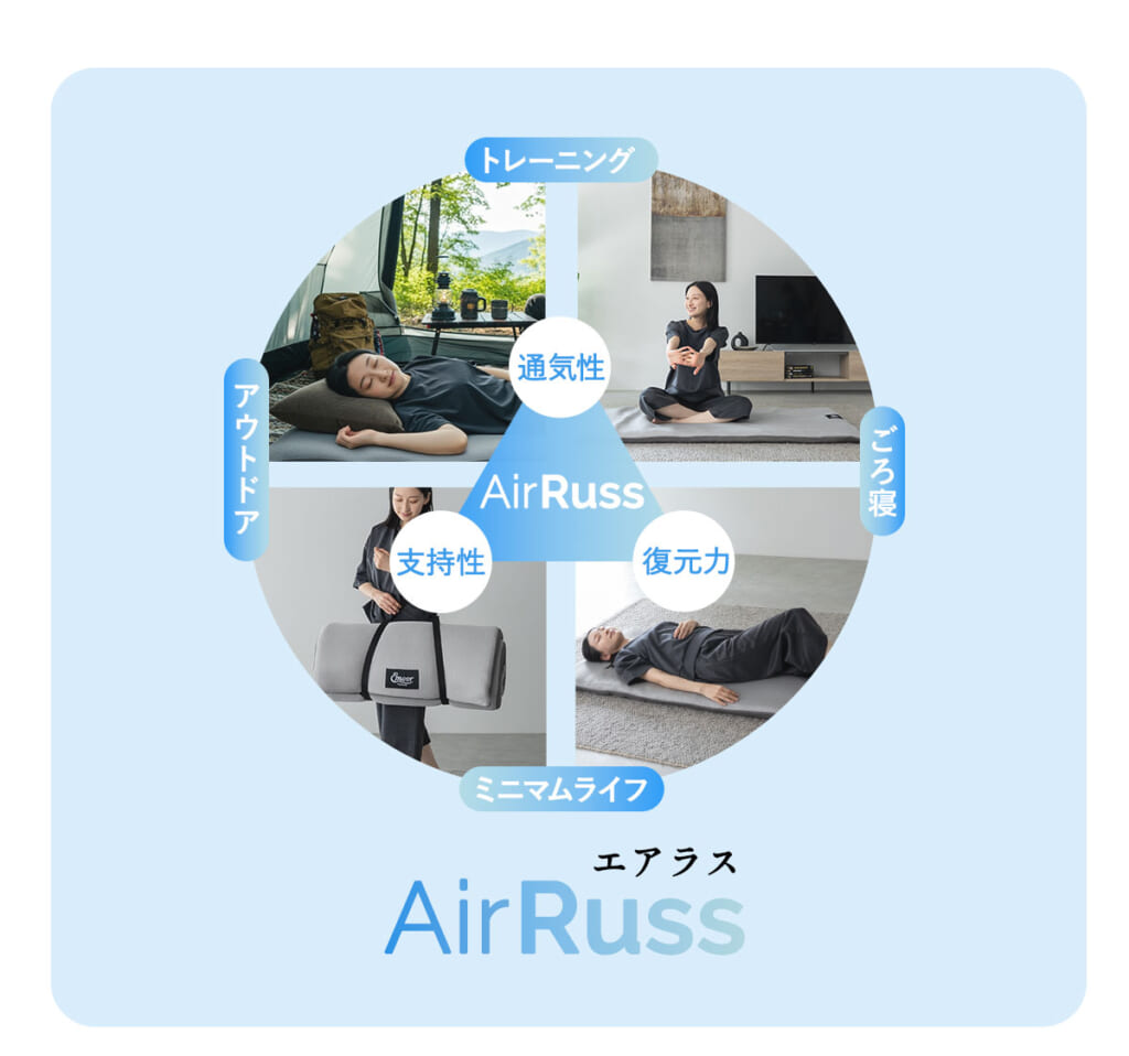 「AirRuss」はエアラスはへたりにくい素材ですが、長期的に使用してへたりが気になる場合にはドライヤーなどで熱を加えることによって形状が復活するという、特殊な特性を持っています。これにより買い替え頻度を減らし長期的に快適な使用を可能にしました。