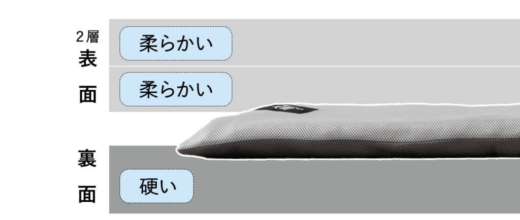 中材の目付と密度の違う2種類のダブルラッセル構造を採用したリバーシブル2層構造により、表裏で硬さが異なる寝心地を実現。厚みの違いではなく特殊素材の密度を変えることで硬めと柔らかめの寝心地を使い分け、通気性が良くへたりにくい素材なので長期的に快適に使うことができます。