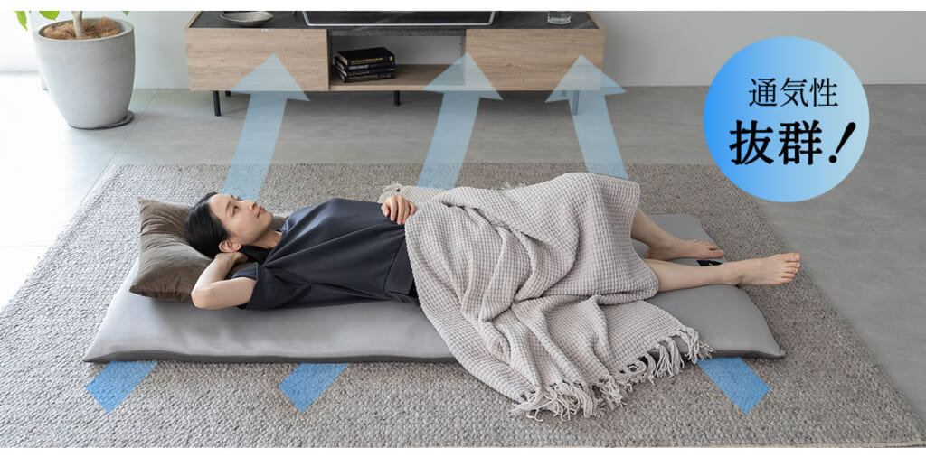 抜群の通気性で暑さや蒸れの悩みを解消し、中材にダブルラッセル構造の『ファインエアー(R)』を採用。この特殊素材は熱を溜め込まない構造なので真夏でもサラッと快適に使用でき、暑い季節に感じやすい「暑さ」「蒸れ」の悩みを解消。汗ばむ季節でも常に心地よく使うことができ、側生地もメッシュ素材のため湿気を効果的に発散させます。