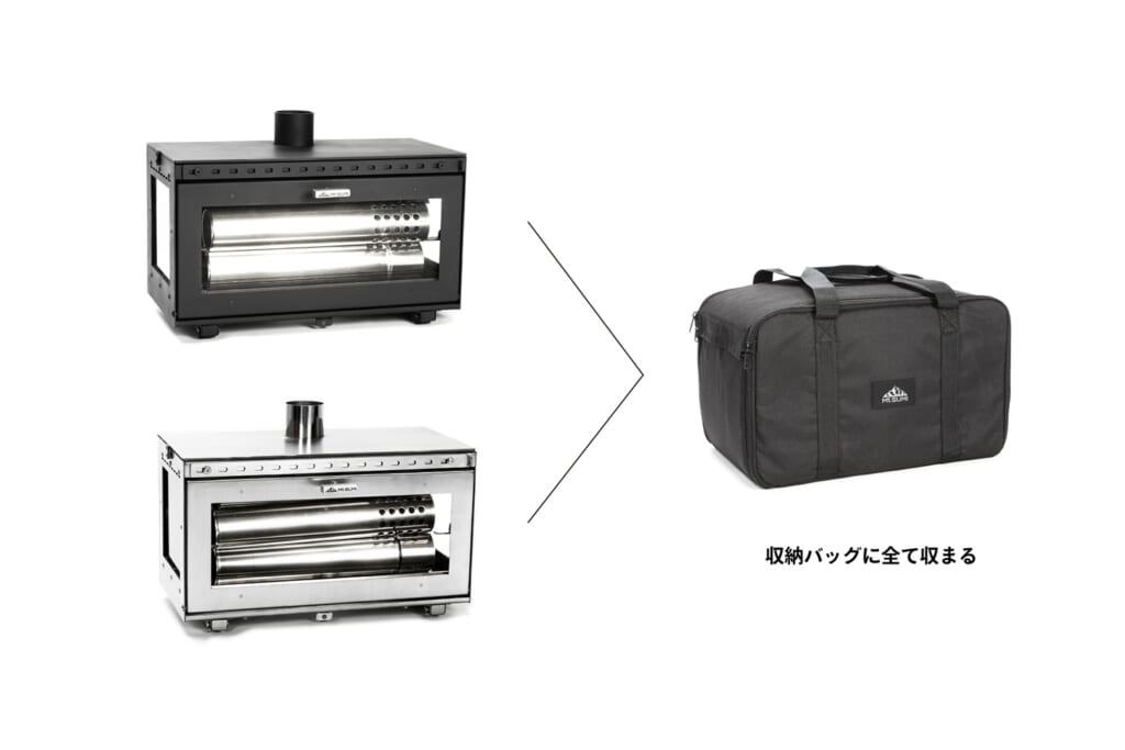 本体重量は約13kg(鉄製12.8kg、ステンレス製12.6kg)と、持ち運びや設置が無理なく行える重量です。さらに、付属の専用バッグには本体だけでなく、煙突やアクセサリー類もすべて収納でき、省スペースでコンパクトにまとめられるのが魅力です。自宅での保管や車載時にも場所をとらず、使いたいときにすぐ持ち出せる利便性の高い仕様です。