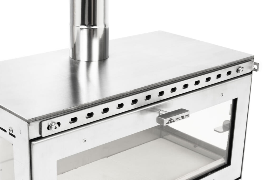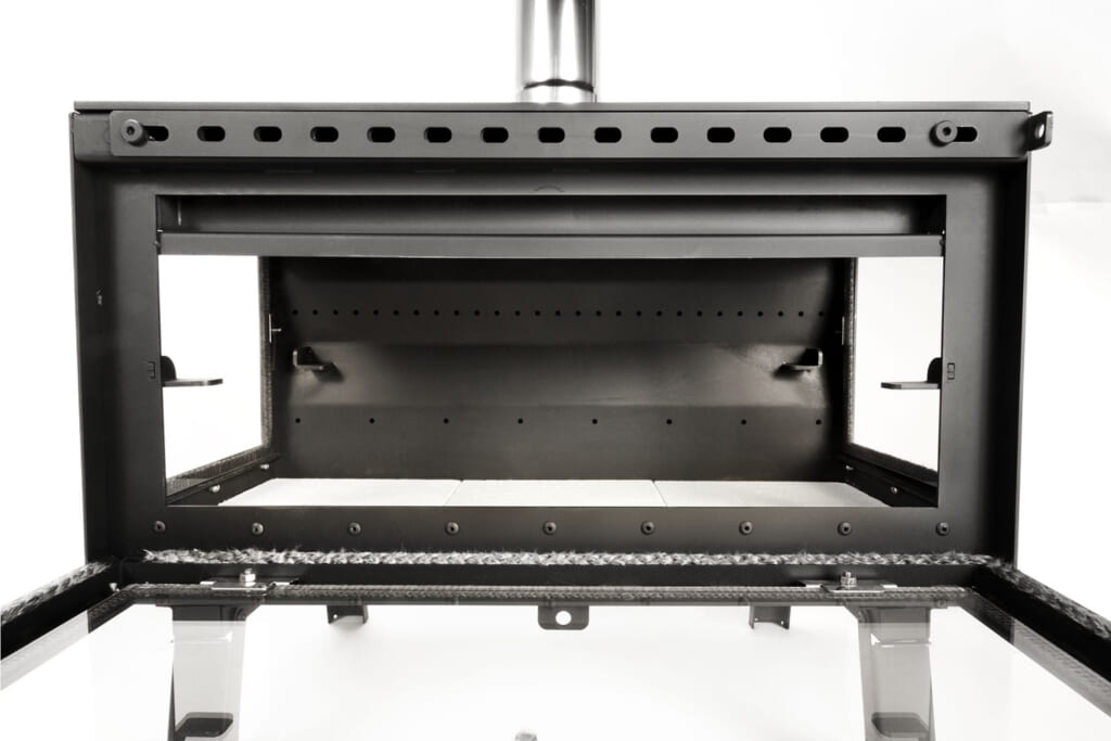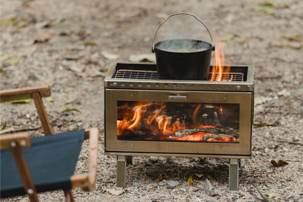 薪ストーブとして天板での調理はもちろん、天板を外すと二次燃焼構造の焚き火台としても使用できます。さらに付属の焼き網を使えばグリル調理も楽しめる3WAYタイプです(※燃料に炭は使用できません)。グリルとしても火の状態がわかりやすく、吸気口や扉を開けて火の調節ができるため、使いやすい構造です。