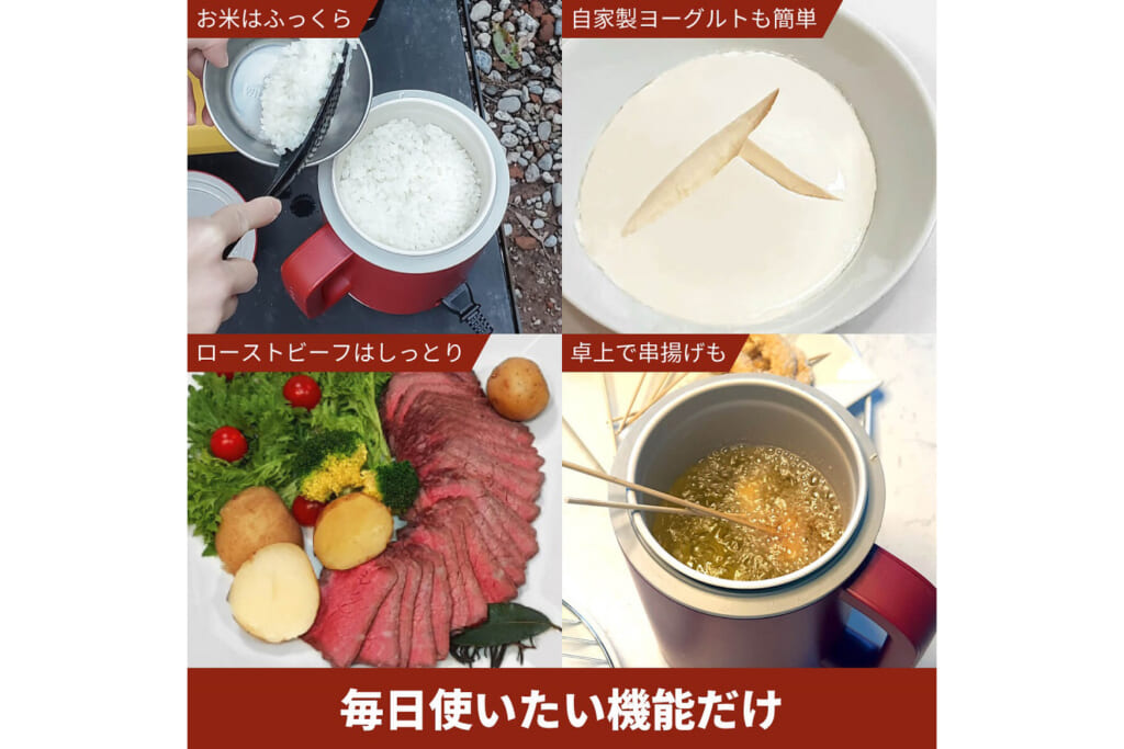 コンパクトながら「炊飯」「発酵調理」「低温調理」「揚げ物」の4つの機能を搭載した万能マルチクッカーは、キャンプ飯のバリエーションを格段に広げます。例えば低温調理でプロの仕上がりになるローストビーフや温泉卵などの火加減が難しいメニューも簡単にプロの仕上がりになります。他にもヨーグルトなどの発酵調理など朝食を豊かにするメニューにも対応。油の温度を一定に保つことが難しかったアウトドアでの揚げ物も「ていとうシェフ」がしっかりサポートしてくれます。