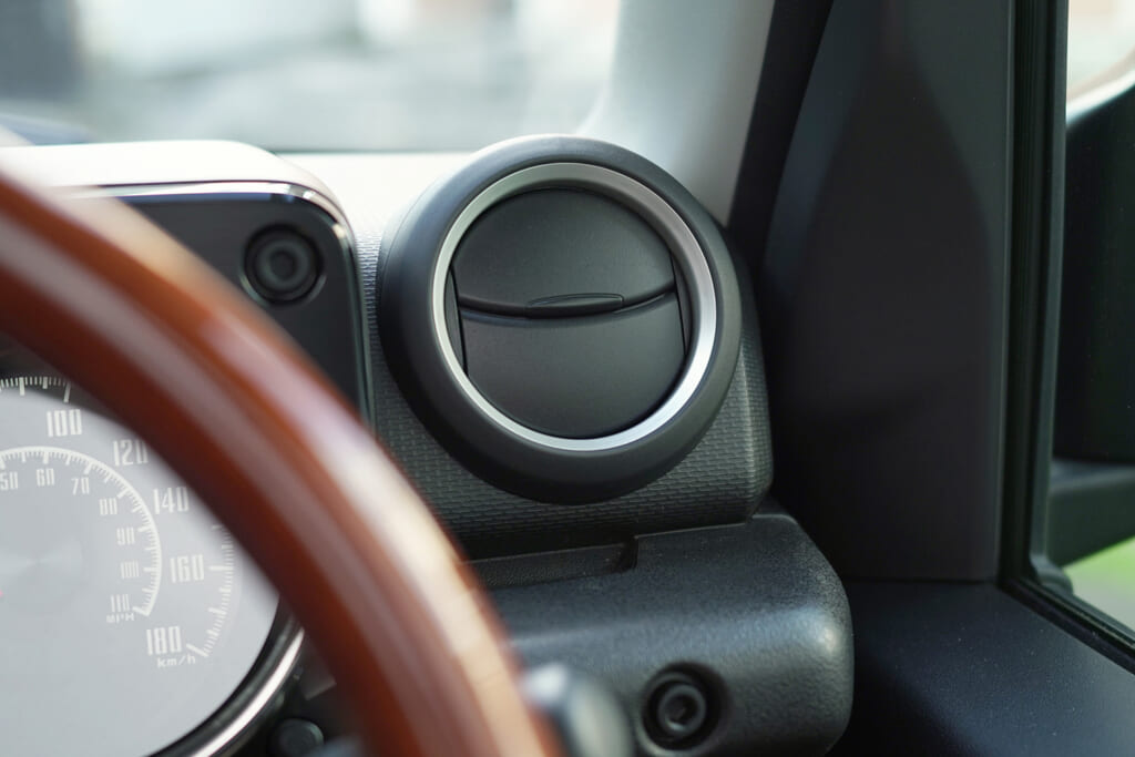 「エアコンルーバーリングキット」は左右のエアコン送風口のリング状装飾部品「エアコンサイドルーバーリング」を交換するためのカスタムパーツです。クラシカルな統一感とシンプルなデザインにより、純正インパネ中央部のエアコン操作3連ダイヤルと統一感を持たせたシンプルなデザインが特徴。