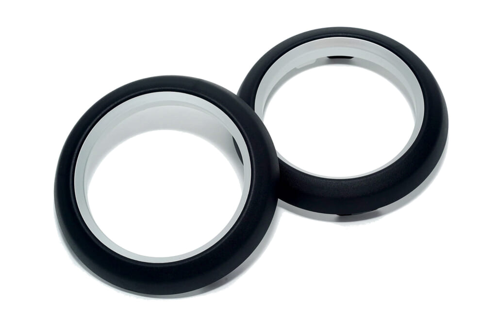 本製品は外側と内側の2つのリングで構成され、外側は純正インパネと同等のポリプロピレン樹脂(梨地処理)、内側は塗装に適したABS樹脂を採用しています。内側はシルバー塗装としていますがユーザー自身で好きな色に塗装して楽しむことも可能でありカスタムの幅が広がります。いずれのアイテムも現行ジムニーシリーズのJB64(ジムニー)、JB74(ジムニーシエラ)、JC74(ジムニーノマド)に適合しており、DIYでの装着が可能です。