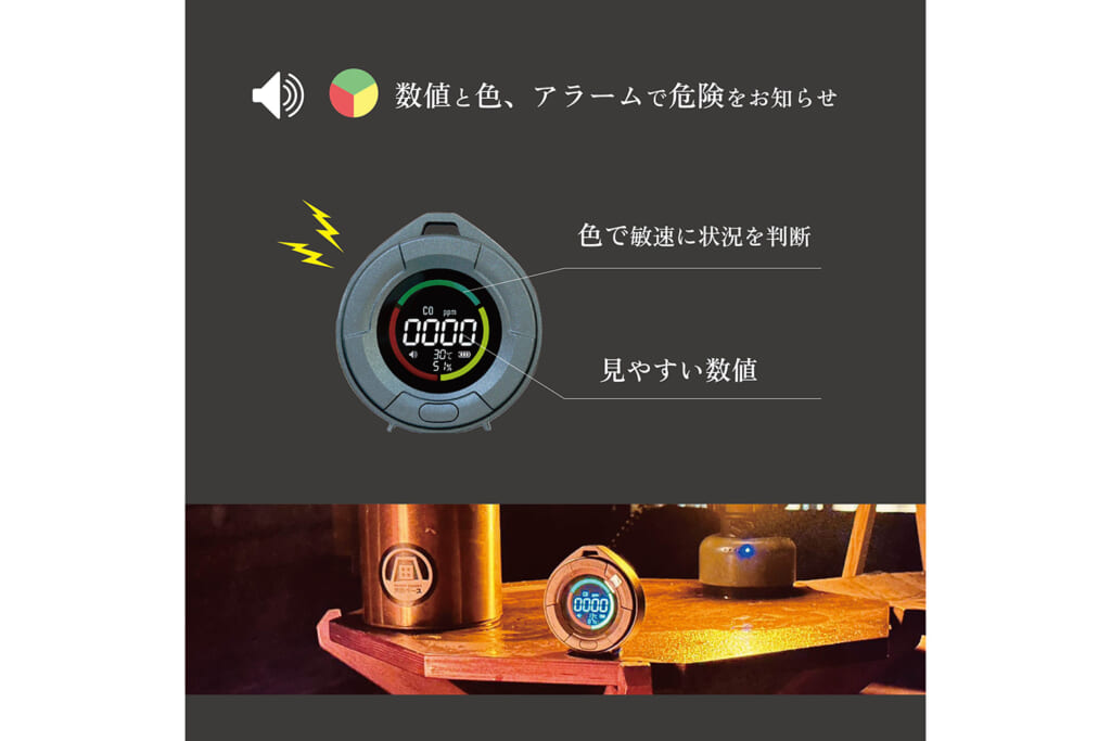 本製品は目に見えず、臭いもない「一酸化炭素(CO)」という見えない危険を数値と色、アラームで知らせる安全ガジェットです。2024年に発売された「日本製センサー搭載モデル」はMakuakeの先行販売で支援額675万円(達成率6754%)を記録。その信頼性の高さから能登地震の救援現場や消防・自衛隊などでも使用されるなど、「プロにも選ばれる信頼性」がSNSやYouTubeを通じて広く評価されています。