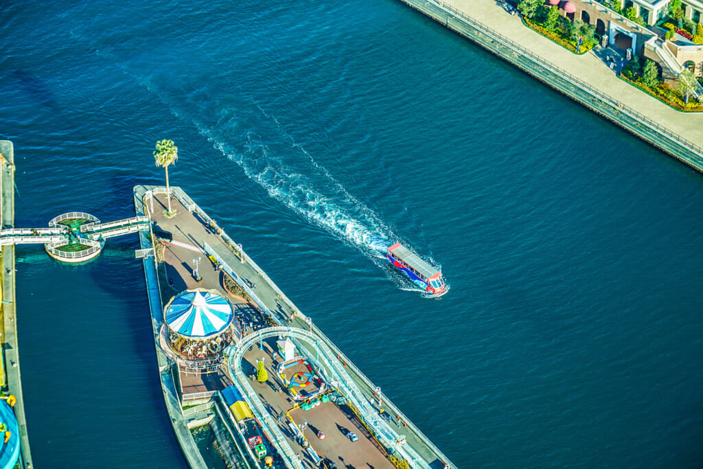 「お台場パノラマコース」では、お台場SKYセンター前を起点にお台場海浜公園などを巡ります。公園に立つ自由の女神像を過ぎたら、ついにスプラッシュイン。海上からは、大井ふ頭のクレーン・コンテナ群や東京湾岸の景色を望むことができます。また、真下から眺めることができるレインボーブリッジも見逃せません。