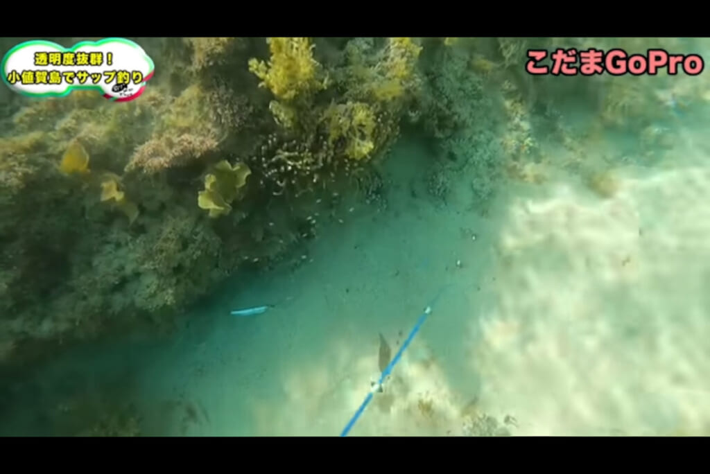 ボードに寝そべり、のんびりと釣り糸を垂らすのがSUPフィッシングの醍醐味。「ちょっと覗いてみっかな~」とこだまさんがGoProを水中へ向けると、むねおさんも「うわ! でかいのおるよ!!」と身を乗り出します。気づけば2人ともボードにうつ伏せ状態。波に揺られるだけでも心地良さそうです。