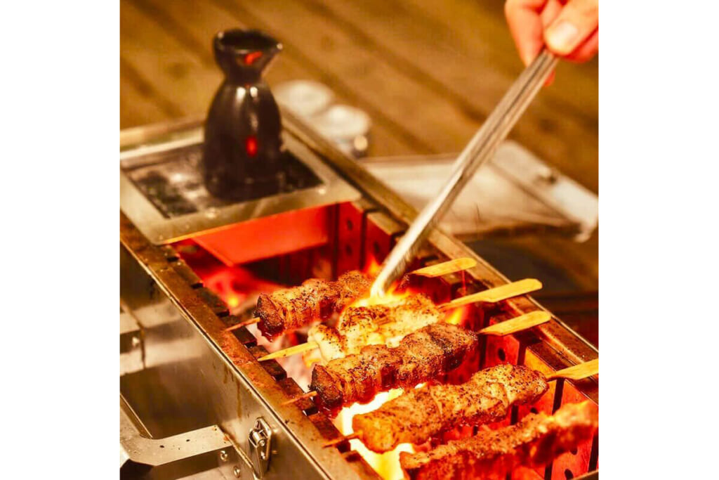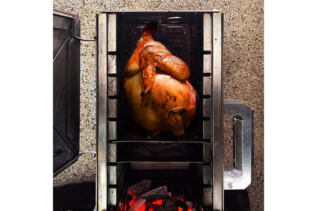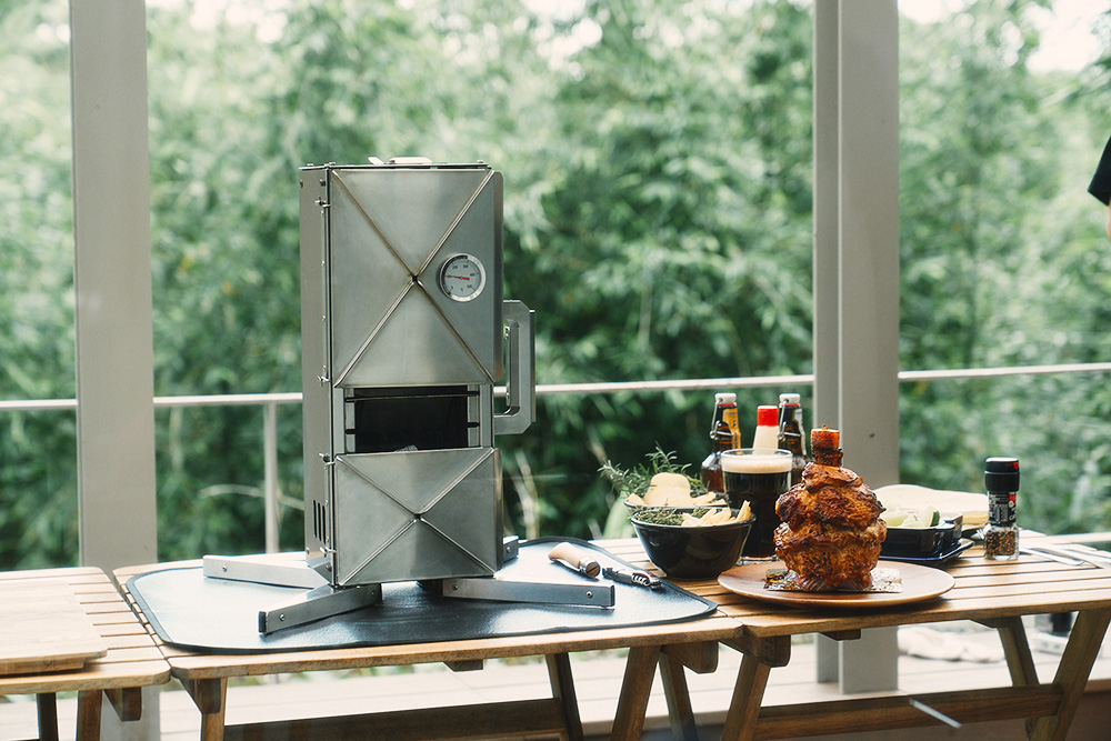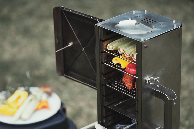 また、独自の二次燃焼構造を活かし、効率的な燃焼を実現します。これにより燃焼時の煙を大幅に抑えることができ、住宅街の庭先や煙が気になるキャンプ場でも周囲を気にせず本格的な焚き火やグリル料理を楽しめます。キャンプ料理家の千葉さおりさんは、「縦置きにすると煙が少なく、匂いも気になりませんでした」とコメント。その他、限られたスペースでの同時調理を可能にしました。