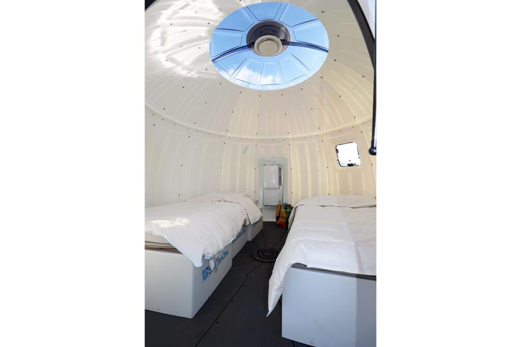 グランピング利用など、レジャーにも適しています。もちろん、外観だけじゃなく内観も角が無く開放的で、実際の縦横3m×高さ2.5mよりも広々と感じられます。有事の際に不要なストレスを感じることなく、快適に過ごせる空間を提供します。シングルベッド2台とエアコンを設置したレイアウトにも十分対応可能です。