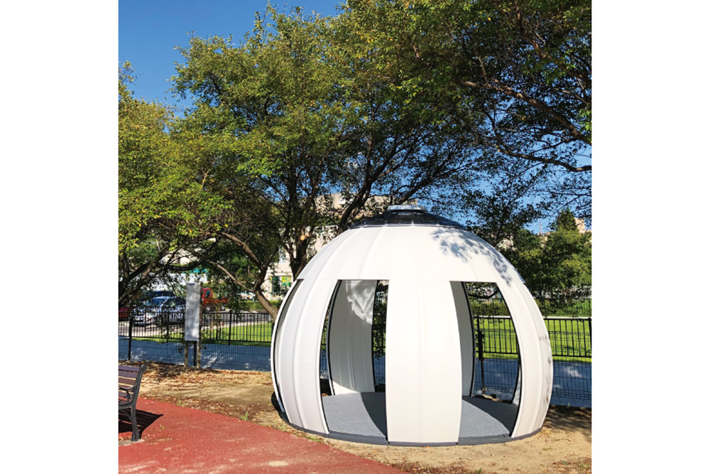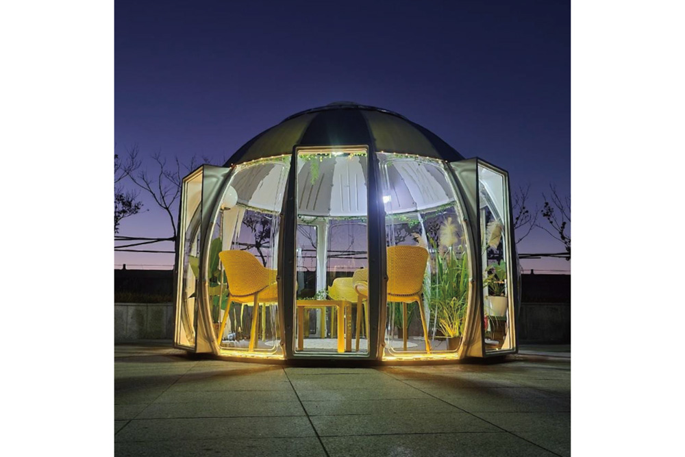 また、交互にパネルを抜いた東屋スタイルやスロープ、夜にも映える全面クリアパネルの追加、さらにドーム同士を連結させることで、コミュニティスペースや医療スペースなど、用途に応じた柔軟な空間設計が実現します。