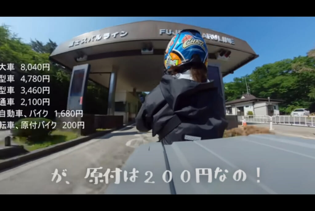 今回の旅のお供であるリトルカブにガソリンを入れ、さっそくバイクを走らせるしーまんさん。心地よいバイクのエンジン音とともに、自然豊かな緑の光景が続きます。コンビニで休憩をはさみながらたどり着いたのは、有料道路“富士スバルライン”。スバルラインの料金は普通自動車が2100円と結構割高ですが、原付ならなんと200円で通行できます。どうやら今回の相棒をカブに選んだのは、この理由もあるようですね。