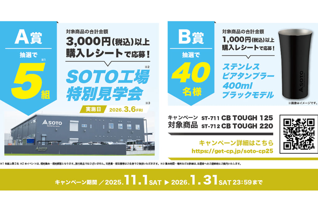 期間中に対象商品を購入しレシートをアップロードして応募すると抽選で「SOTO工場特別見学会」や「オリジナルタンブラー」などが当たります。