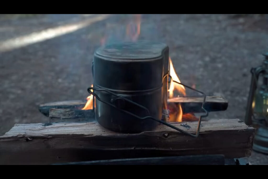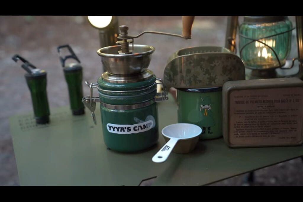 今回の動画は前後編の後編となり、前編では焼きそばを調理して食べていました。その後のティータイムということで、焚き火でお湯を沸かしてコーヒーを淹れていきます。使う道具は新品のコーヒーミルやコーヒードリッパーなどで、やはりカーキ色縛りでした。
