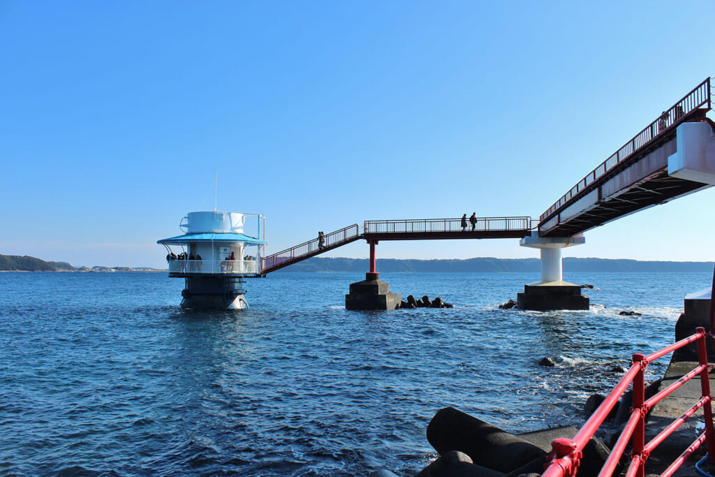 リアス式海岸の景勝地・千葉県勝浦市の「かつうら海中公園海中展望塔」には、高さ24.4m、水深8mの海中展望塔が。長いらせん階段を降りると、海中を覗く窓がたくさん設置されています。窓の上には魚の種類が描かれたパネルがあり、窓から見えた魚の名前をさがすのも楽しみのひとつ。また、餌やりの時間には一気に群がる魚を鑑賞できたり、時にはサメに遭遇するなんてこともあるようです。