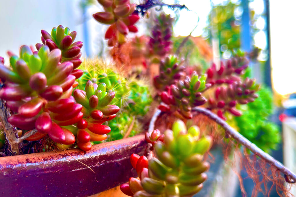 今回は紅葉です。秋も深まりもう冬なの? という気温が急激に下がった今日この頃です。知らない間に多肉植物とサボテンが赤く紅葉しているではありませんか! 肉厚でぷくぷくと可愛いい小さい葉が特徴のセダムが緑から赤へと色付いていました。サボテンも赤茶色に変化して紅葉しているではないですか! 多肉植物もサボテンも寒くなって日照時間がグッと短くなり、寒暖差が大きくなると紅葉するんですね。