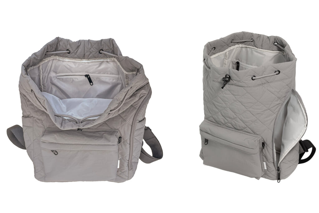 荷物の整理整頓や確認もスムーズに行えます。また、大きく開くサイドファスナーは、巾着を閉めたままでも、横のファスナーから中の荷物を簡単に取り出すことができます。リュックを完全に下ろさずに、必要なもの(財布やスマートフォンなど)をスムーズに取り出せるため、紅葉狩りや家族でのお出かけなど、秋冬のアクティブなシーンでの使い勝手が格段に向上します。