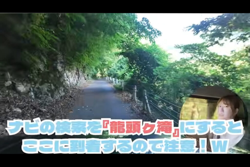 車通りの少ない緑に包まれた道を、ゆっくりと進むこなつさん。ナビの案内に従って進んでいくと、なぜか駐車場ではなく細い山道に入ってしまいました。どうやら「龍頭ヶ滝」とだけ設定していたため、滝のある場所そのものに案内されてしまったようです。