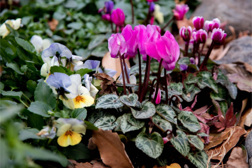 可愛らしい葉の模様と、炎が立ち上がったような花姿が特徴のシクラメン。以前は冬の間は室内で楽しむものでしたが、寒さに耐えるよう品種改良されたのがガーデンシクラメンです。