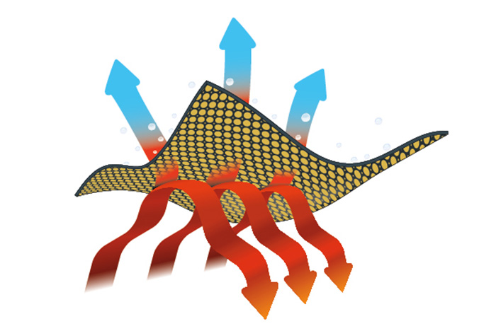 これにより体の熱(体熱)を反射してウェア内に閉じ込める熱反射効率が大幅に向上。身体から放出される熱を効果的に反射し、外気へ逃がすことなくウェア内部に留めます。もちろん、ウェア内部の保温層を厚くすることなく、高い暖かさを実現できるため、ダウンジャケット全体の軽量化とボリュームの抑制に貢献。着ぶくれしにくく、動きやすさを確保します。