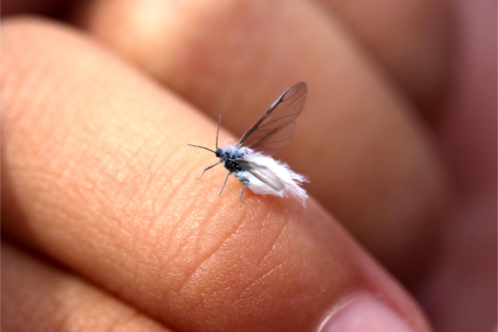 雪虫を雪のように見せているふわふわとした白い物質は、実は蝋(ロウ)でできた綿毛です。彼らは植物の汁液を吸って栄養を摂取しますが、その過程で炭素が過剰になります。これをただ排出するのではなく、体内から分泌して身にまとっているのです。この白い綿は、体を保護する役割があるとも言われています。