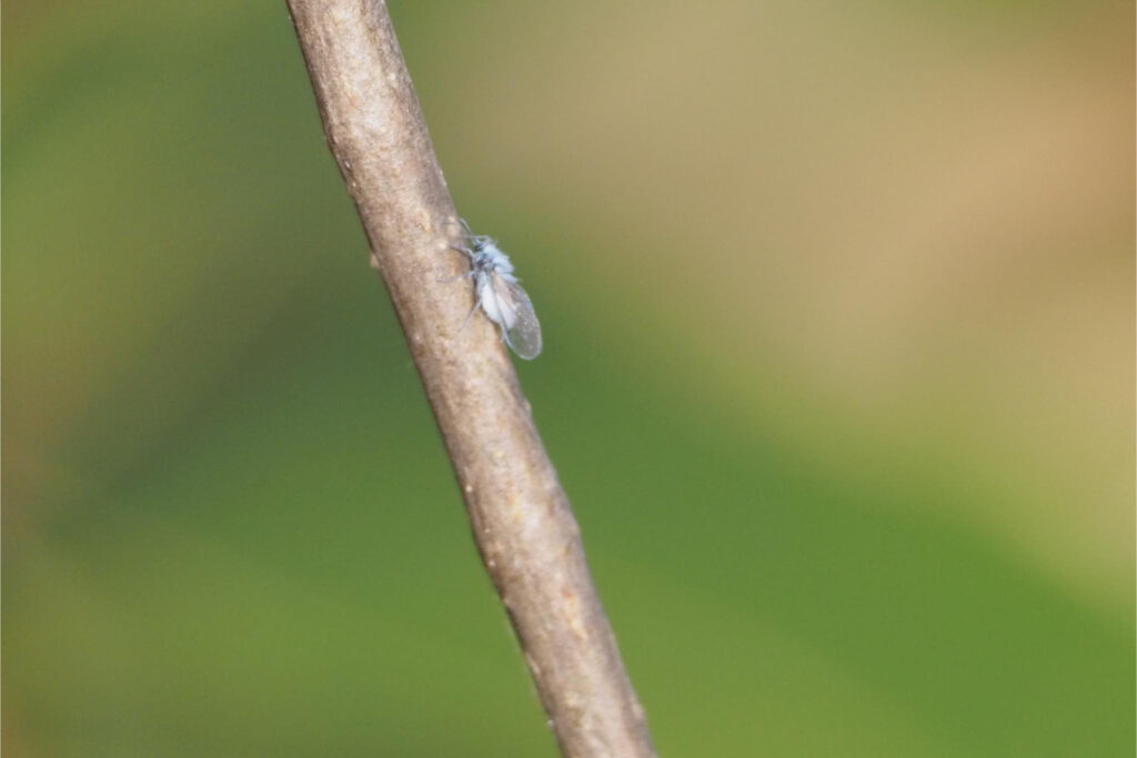 また、雪虫と同じく蝋を身にまとう昆虫に、ハゴロモ(羽衣)類の幼虫がいます。ハゴロモの幼虫も、白い蝋状の綿を付けていますが、雪虫のように風にふわふわと舞うのではなく、植物の上をジャンプしながら移動します。このように白い「綿」を持つ虫は他にもいますが、晩秋に空中を漂うのが雪虫の特徴です。